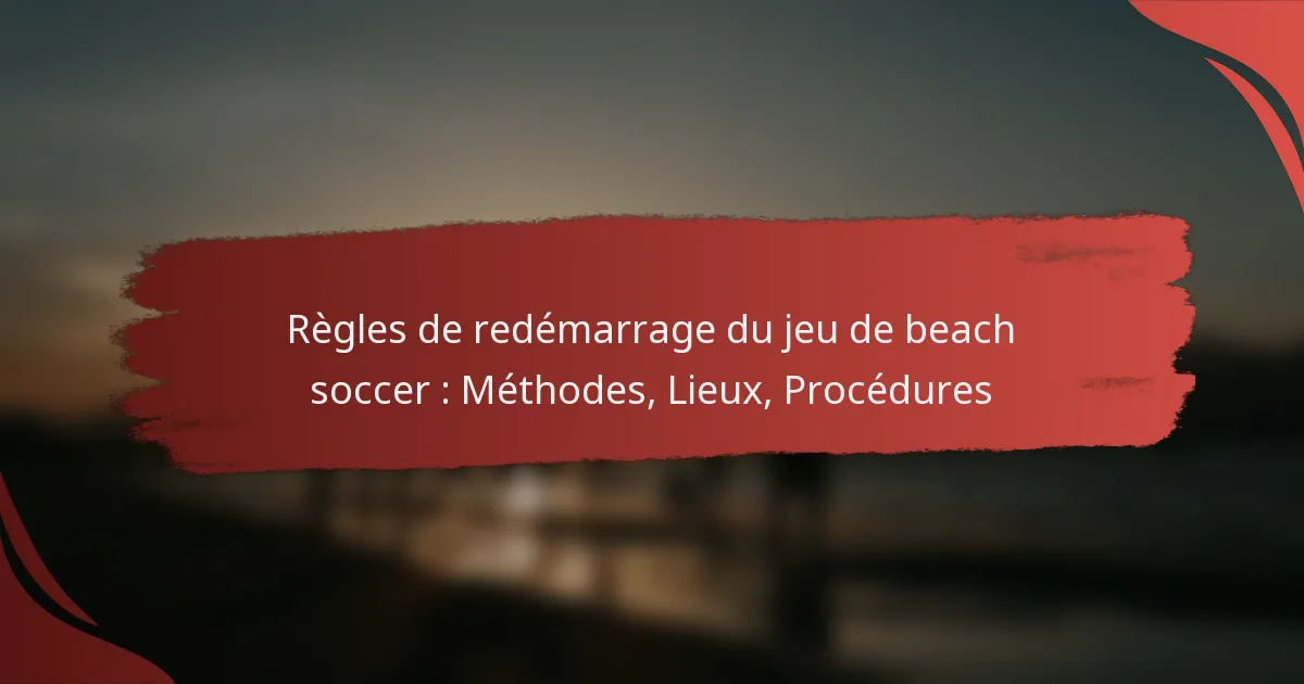 Les matchs de football de plage peuvent être relancés par divers moyens, y compris les remises en jeu, les coups de pied de but, les coups francs, les corners et les penalties. Chaque méthode a des règles et des procédures spécifiques auxquelles les joueurs doivent se conformer, garantissant un jeu équitable et un déroulement fluide du match. De plus, les relances se font dans des zones désignées sur le terrain, essentielles pour maintenir la clarté et l’ordre pendant les matchs.